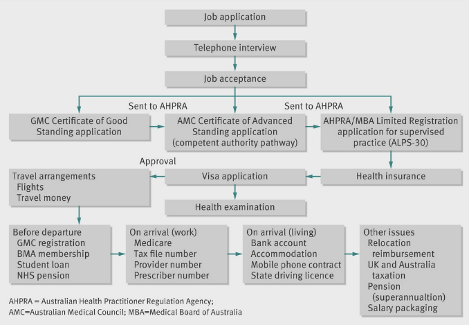 由于近年来,在澳洲执业的英国医生的数量逐步增加,申请澳大利亚的医生工作的机会越来越有竞争力,申请澳大利亚医生工作的方式有3种以下途径:国家招聘网站、直接医院申请或者医疗招聘机构招聘。这个过程大概需要几个月的时间,具体的时间要取决于您的申请的医院和工作。一旦你的工作申请被认可,一般是先进行电话或视频面试。下图总结了从工作申请到抵达澳大利亚的过程。