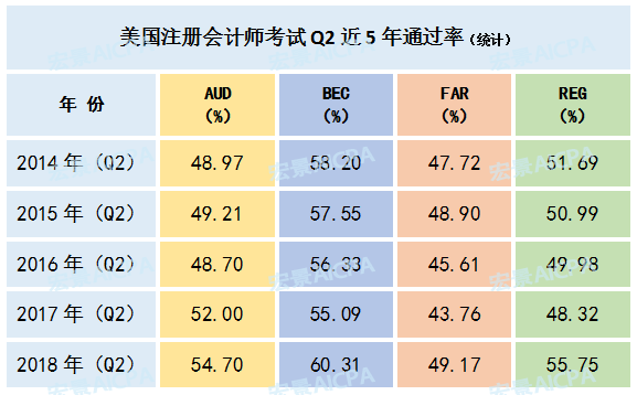 近日,AICPA公布。2018年美国注册会计师考试Q2考期通过率,如下