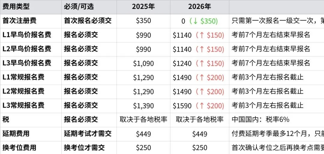从2026年起,CFA考试不需要交注册费,首次报名一级考试费用将降低$200,从原来的【$350+$990=$1340】变为【$1140】。