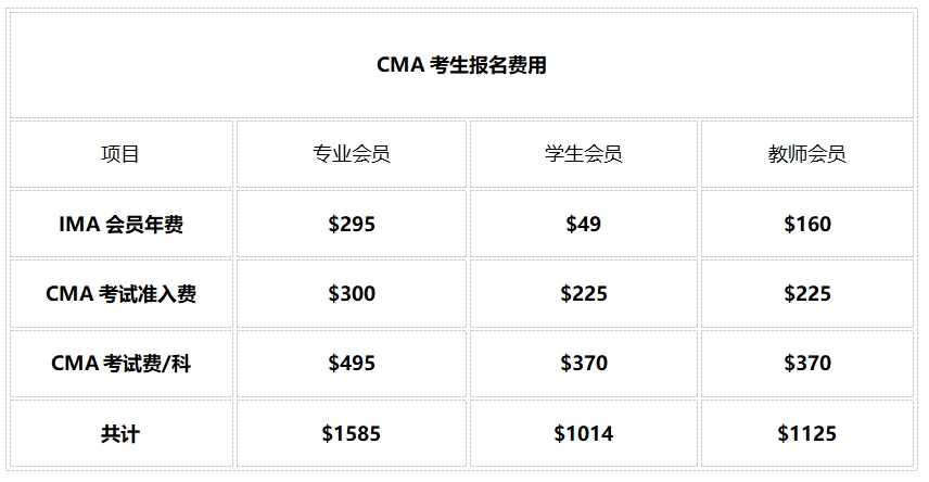 2025年cma考试报名费用具体多少钱,与考生类型有关,2025年cma报考费用分为年费(包含注册费)、准入费和单科考试费,在职考生报名费用为1585美元,学生考生和教师考生费用分别是1014美元和1125美元。以下是详细的费用明细: