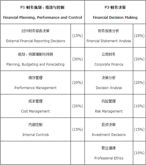 P1-财务规划、绩效与控制主要是对内,优化企业经营管理;P2-财务决策主要是对外,负责企业战略扩张参与对外经营决策,两门科目承上启下,紧密相连。如:P1 外部财务报表决策与P2财务报告分析;P1 内部控制与P2 风险管理和职业道德,P1 成本管理与P2 决策分等,都是紧密相连的。