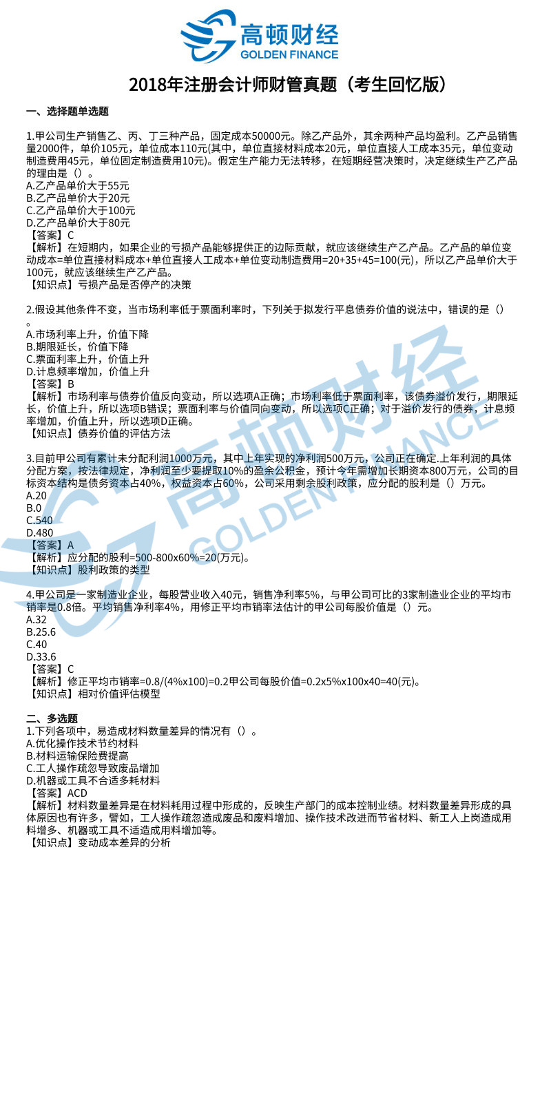 2018年CPA财管真题下载