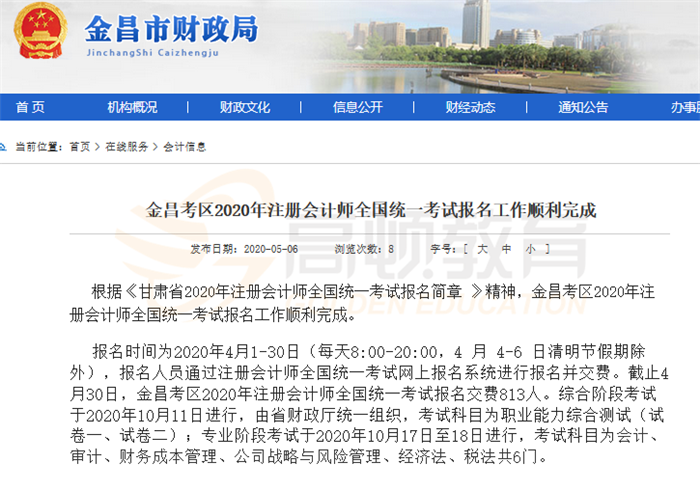 报名时间为2020年4月1-30日(每天8:00-20:00,4 月 4-6 日清明节假期除外),报名人员通过注册会计师全国统一考试网上报名系统进行报名并交费。截止4月30日,金昌考区2020年注册会计师全国统一考试报名交费813人。综合阶段考试于2020年10月11日进行,由省财政厅统一组织,考试科目为职业能力综合测试(试卷一、试卷二);专业阶段考试于2020年10月17日至18日进行,考试科目为会计、审计、财务成本管理、公司战略与风险管理、经济法、税法共6门。