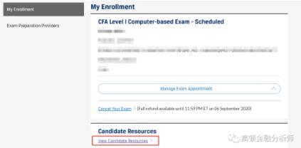 CFA Program”进入自己的报考情况,在下方,可以看到“View Candidate Resources”这个选项,点击进入考生资源页面。