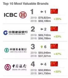 2018年中国银行业品牌价值增长28%,品牌总值达4069亿美元,其中以工商银行、建设银行、农业银行和中国银行分别位列“全球最具价值银行品牌”排名的前四名。