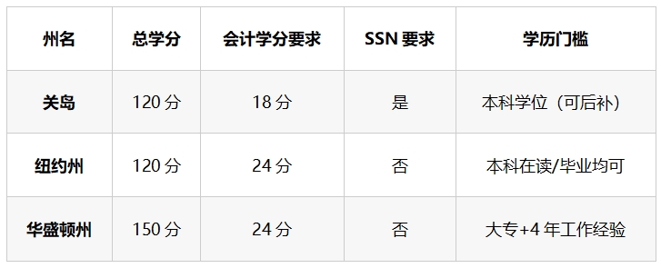 USCPA报考需重点关注学分结构、社会安全号(SSN)要求、学历门槛。并非所有州都要求本科学位或SSN,选州策略直接影响报考成功率: