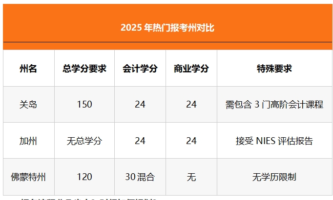 学分细节:会计与商业学分要求更趋严格。例如,科罗拉多州新增“3个道德学分”,特拉华州要求“6个商法学分”,考生需提前核对报考州的具体课程清单。