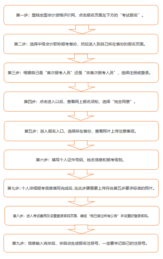 全国会计资格评价网"。阅读《报考人员必读事项》及《公告》所有内容及要求,接受网上报名须知,选择报考省份,查看报名流程,填写报考信息,完成注册报名及交费。实行考试前报名资格审核的省(区、市)的报考人员,在完成报名资格审核后方可在报名系统中进行报名确认及交费;实行考试后报名资格审核的省(区、市)的报考人员,可直接在报名系统中进行报名确认及交费。