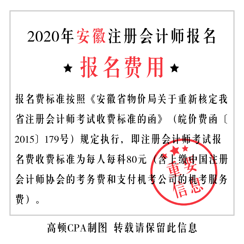报名费标准按照《安徽省物价局关于重新核定我省注册会计师考试收费标准的函》规定执行,每人每科80元。