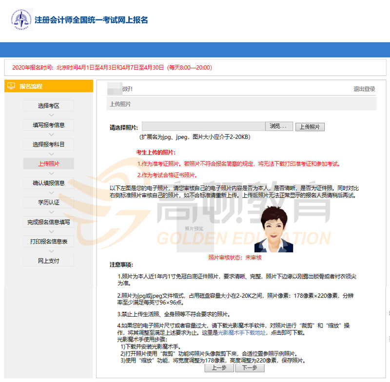④上传照片:考生要上传符合规定的照片(照片的要求:电子照片应为免冠、白底、清晰、完整的证件照,像素:178像素×220像素,分辨率至少满足每英寸98×98点,jpg或jpeg文件格式)。