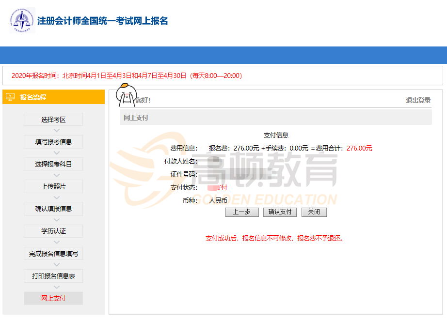 ⑧网上支付:交费完成视为报名程序完成。交费截止时间为4月30日 20:00。交费手续完成后,所报考科目及相关信息不能更改,且报名费不予退还。