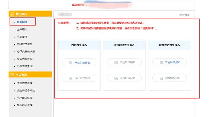 根据自身情况,选择考生类型和考试阶段(请考生慎重选择,报名类型选定后将无法修改)。