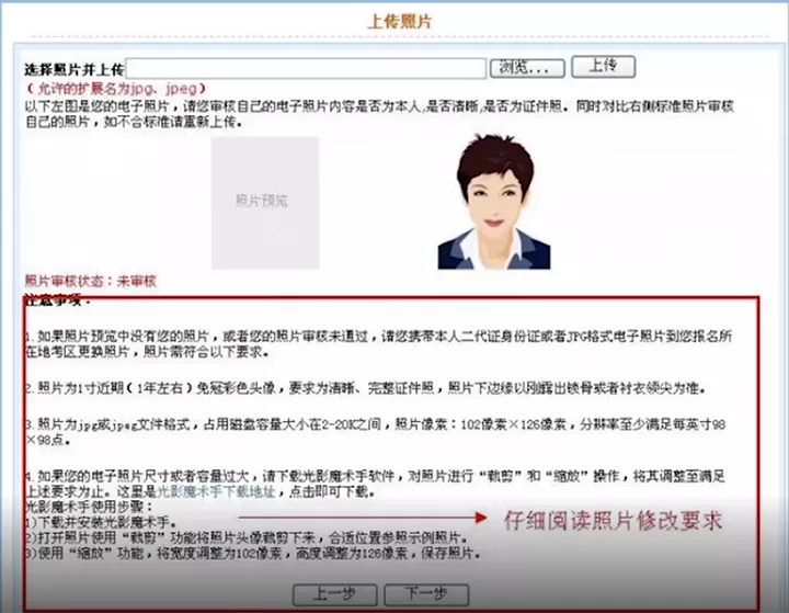 首次报名人员一定要上传符合要求的、本人近1年的1寸免冠白底证件照片(jpg或jpeg格式,文件大小2-20K,102像素×126像素)。上传的照片将作为准考证和考试合格证书照片,若照片审核不通过,则无法下载打印准考证和参加考试。