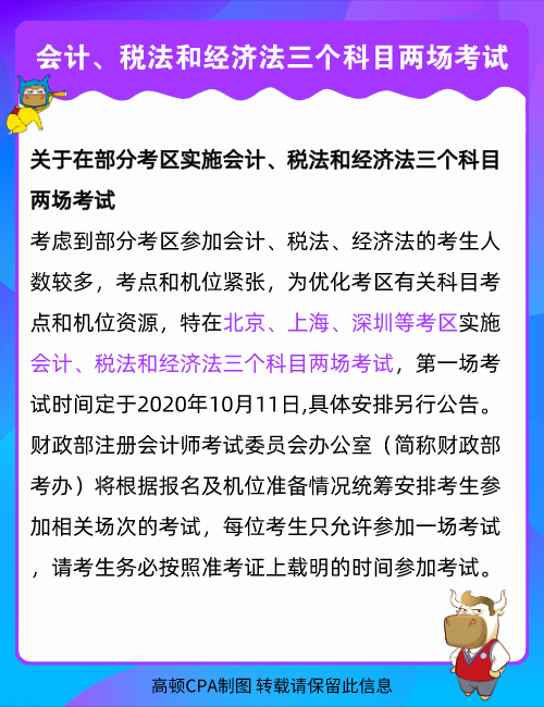 5、部分地区专业阶段实行两场考试:关于在部分考区实施会计、税法和经济法三个科目两场考试考虑到部分考区参加会计、税法、经济法的考生人数较多,考点和机位紧张,为优化考区有关科目考点和机位资源,特在北京、上海、深圳等考区实施会计、税法和经济法三个科目两场考试,第一场考试时间定于2020年10月11日,具体安排另行公告。
