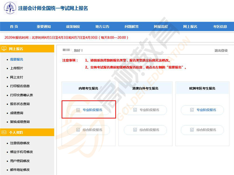 3、选择考试阶段。注意慎重选择报名类型,报名类型在选定之后将无法进行修改。