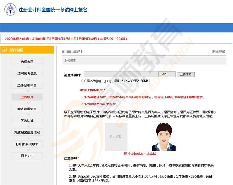 7、上传照片。按要求上传符合规则的照片。(照片的要求:电子照片应为免冠、白底、清晰、完整的证件照,像素:178像素×220像素,分辨率至少满足每英寸98×98点,jpg或jpeg文件格式)。