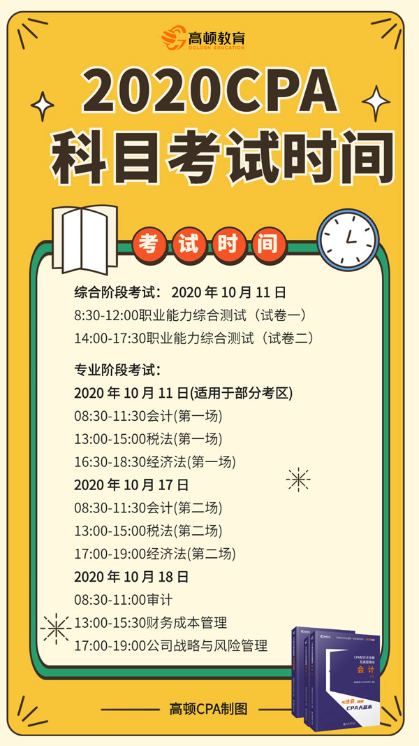 2020年常州注册会计师考试时间已经公布了,今天和往年不同,专业阶段和综合阶段考试都在十月份,部分地区专业阶段会计和经济法、税法科目设置的有两场考试,每位考生只能参加一次考试,具体考试时间安排跟着高顿CPA小编一起来看下吧!
