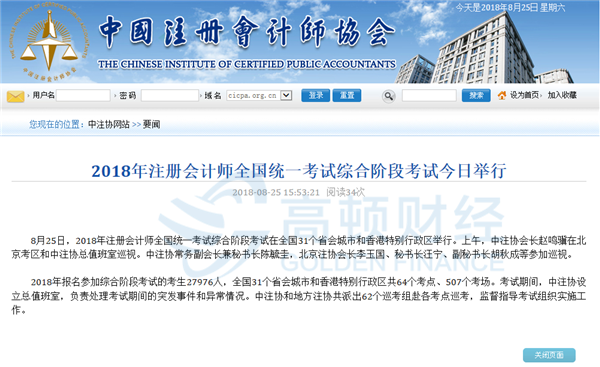 8月25日,2018年注册会计师全国统一考试综合阶段考试在全国31个省会城市和香港特别行政区举行。上午,中注协会长赵鸣骥在北京考区和中注协总值班室巡视。中注协常务副会长兼秘书长陈毓圭,北京注协会长李玉国、秘书长汪宁、副秘书长胡秋成等参加巡视。