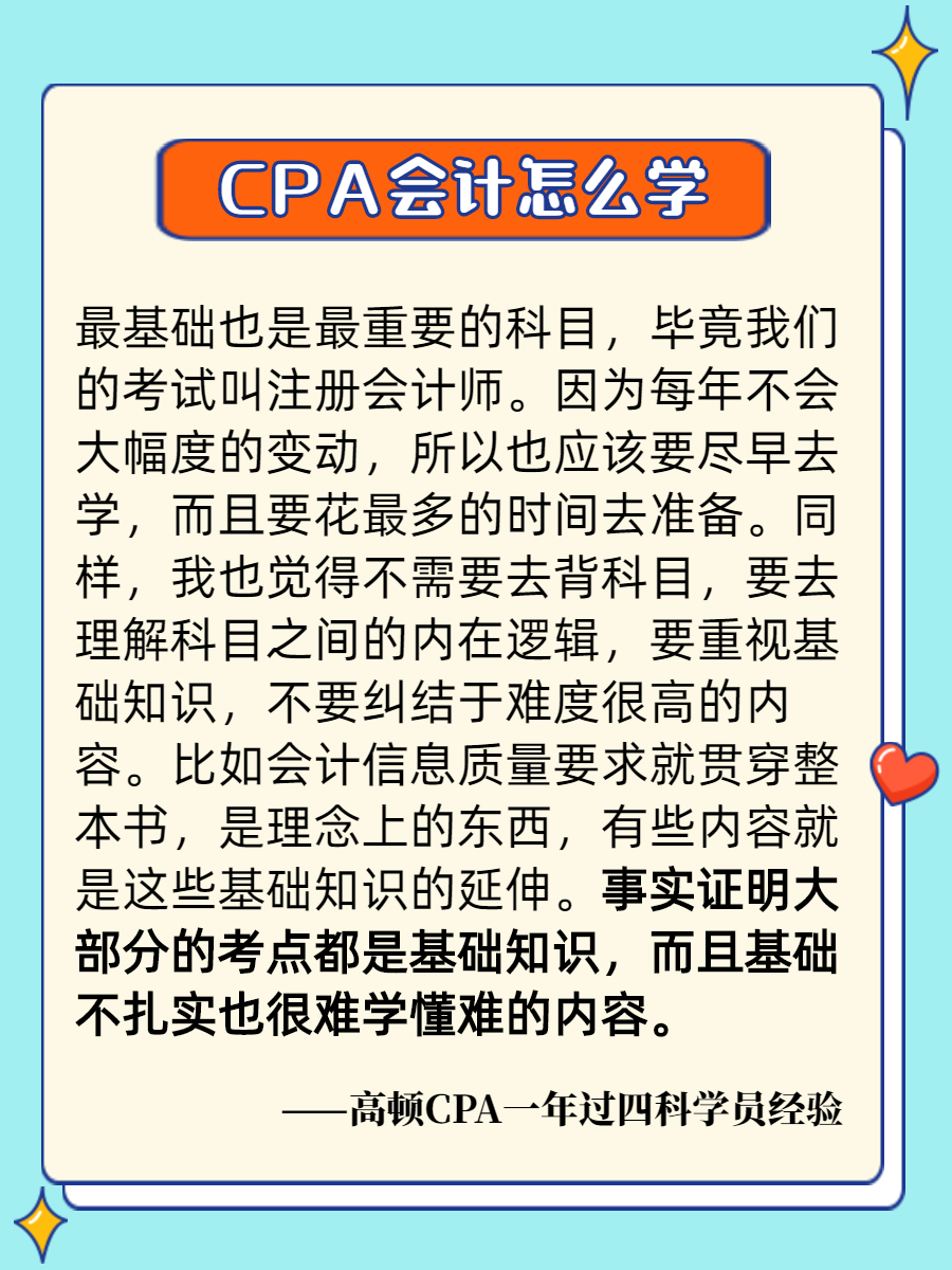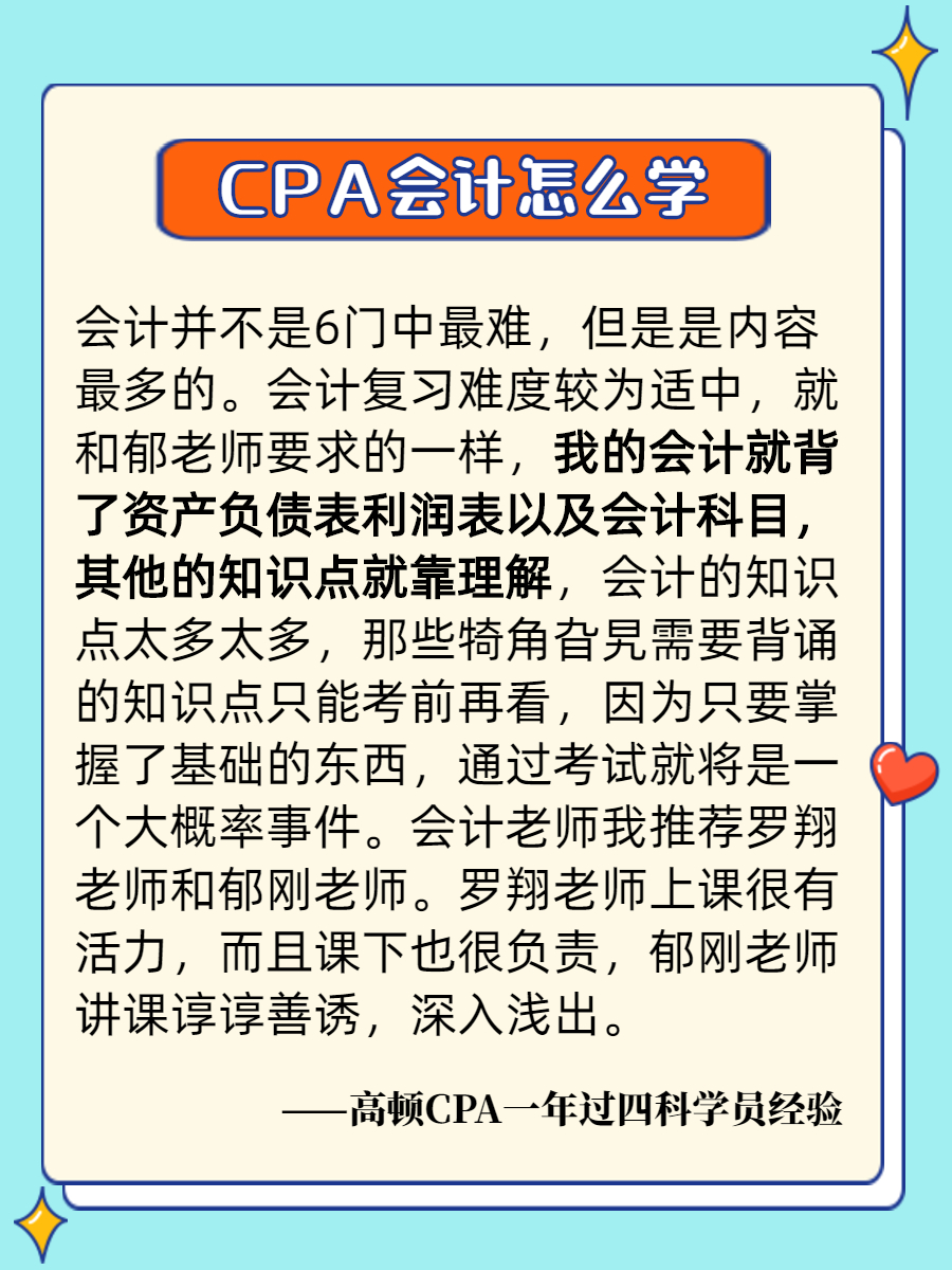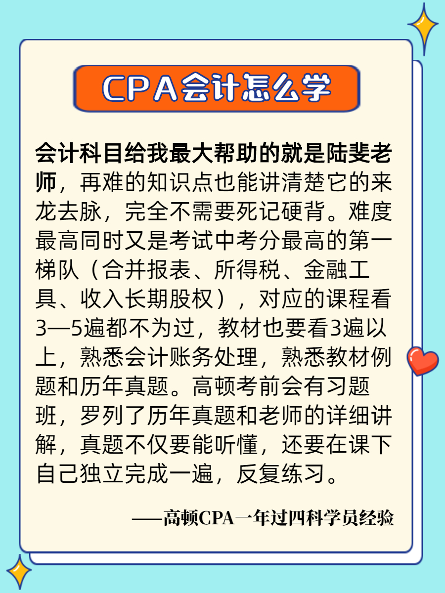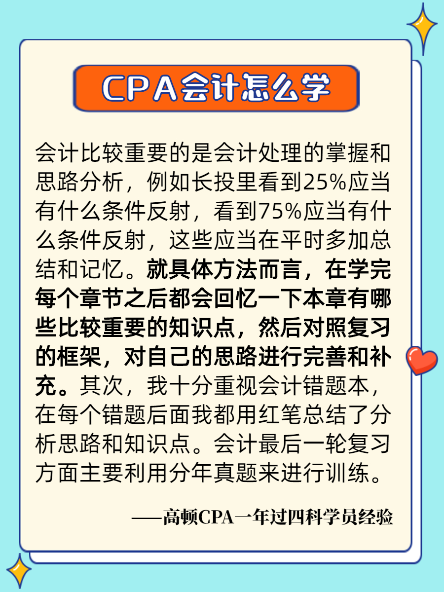 高顿CPA研究院老师表示,会计科目是CPA六科中考试人数最多的,每年约有7成考生参考。每年考试结束基本都会有不少考生反馈,考的不难,只是不会,似曾相识的!一些已经通过会计科目考生的学习经验、考试经验,可以重点参考!