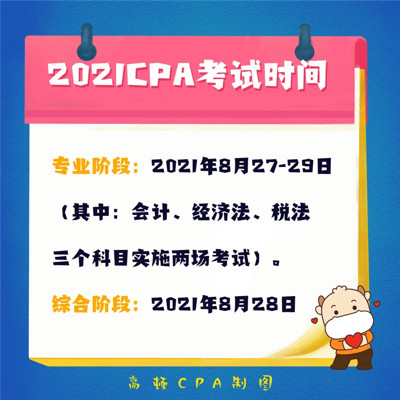 2021年注会考试时间专业阶段为:2021年8月27日-29日,其中会计、审计、税法三个科目依然会分两场考试