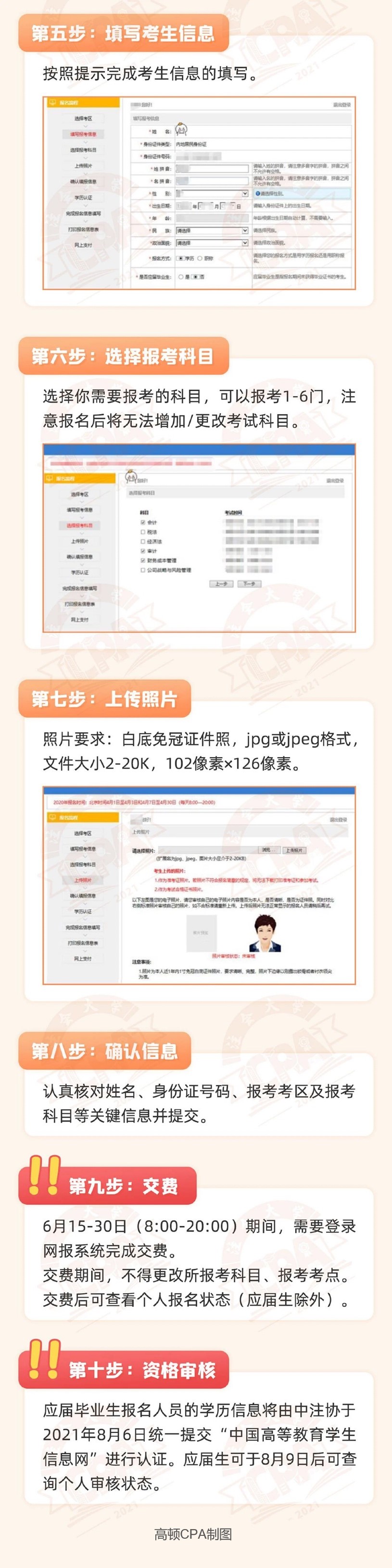 首先我们先了解一下2021年CPA考试的全部流程步骤,总共需要约10步完成。