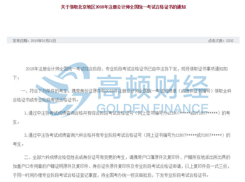 【高顿CPA】2018年北京注册会计师考试合格证领取通知