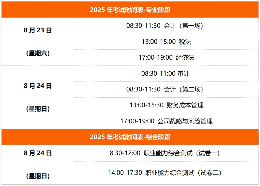 2025年注册会计师专业阶段考试定于8月23日-24日(周六、日),综合阶段同步于8月24日开启。对比往年,考试总时长从3天减少至2天。2025年考试时间安排如下表: