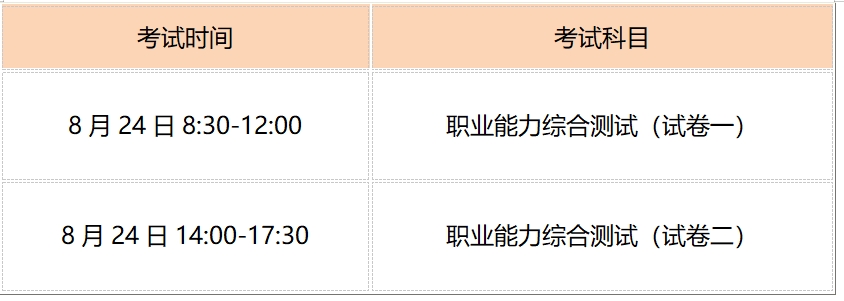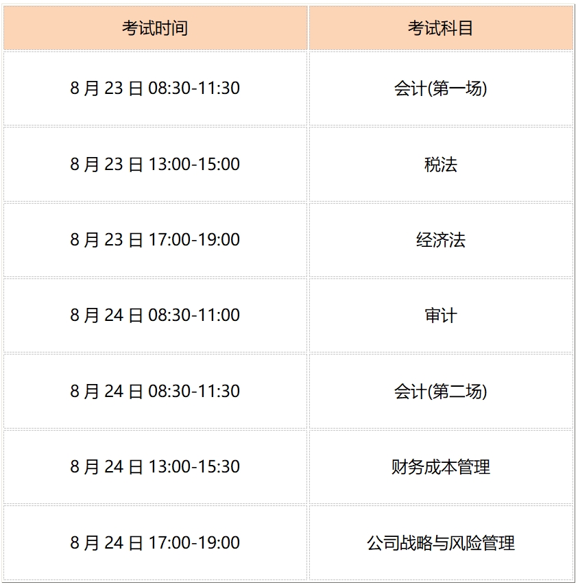 注册会计师考试通常于每年8月下旬举行,2025年专业阶段考试时间为8月23日至24日,综合阶段为8月24日,具体安排如下表所示: