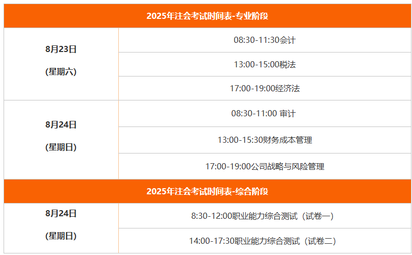 2025年注册会计师考试时间安排在8月23日或24日,分为专业和综合两个阶段,具体如下表所示: