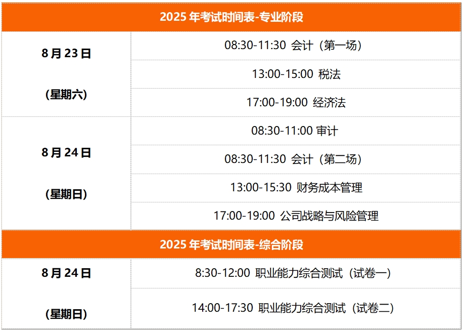 2025年注会专业阶段考试定于8月23日至24日,其中《会计》科目在部分考区分两场进行;综合阶段考试与专业阶段最后一天重叠,于8月24日举行,具体安排如下表所示: