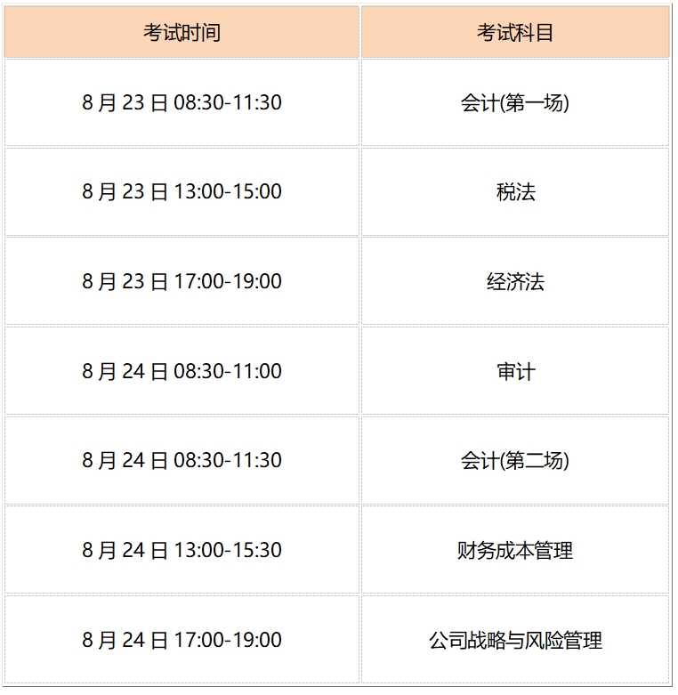 相比以往,今年的注册会计考试时间缩减了一天,定于8月23日至24日,具体安排如下: