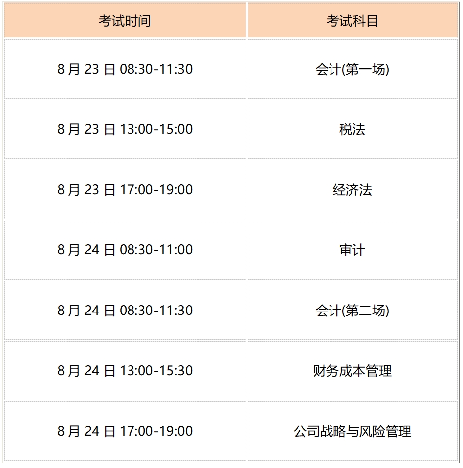 2025年cpa考试时间较往年缩短1天,专业阶段考试集中于8月23日-24日,综合阶段考试为8月24日,其中会计科目因报名人数在部分考区实施两场考试,具体安排如下表所示: