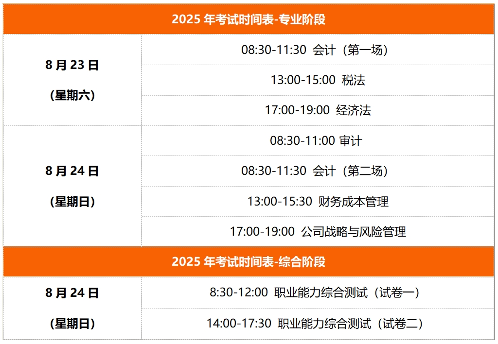 2025年注册会计师专业阶段考试时间调整为8月23日至24日,综合阶段考试定于8月24日,欧洲考区则为8月30日至31日。各科考试时间安排表如下: