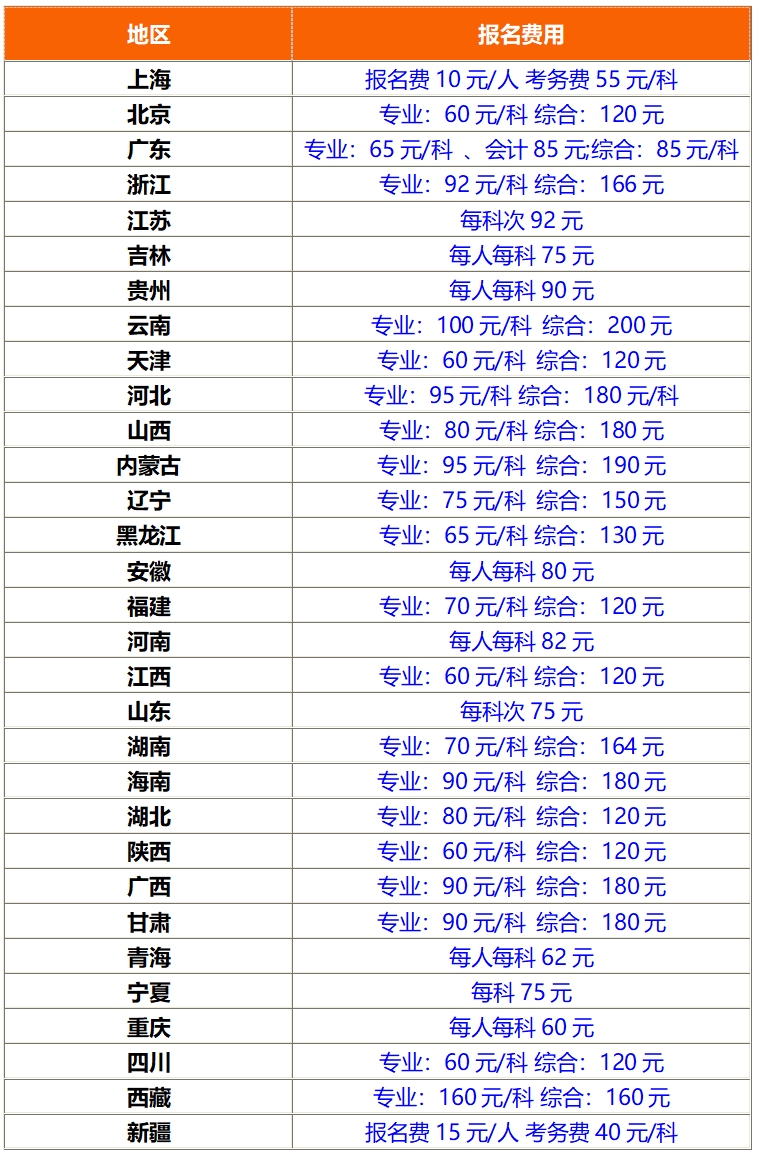 2025年cpa报名费用采用“属地化”原则,各省标准不同,单科费用在55-200元区间。各省收费标准如下表: